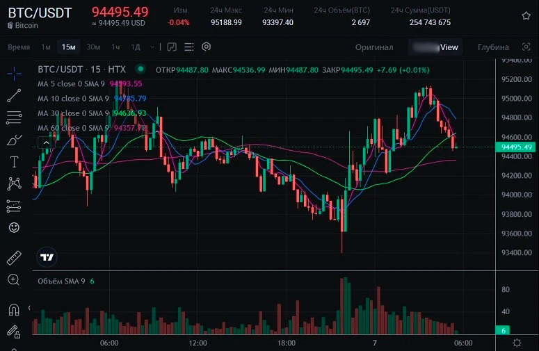 Заниматься трейдингом на HTX нетрудно. Этому способствует хорошо проработанный торговый терминал. Для начала нужно выбрать предпочитаемую пару.