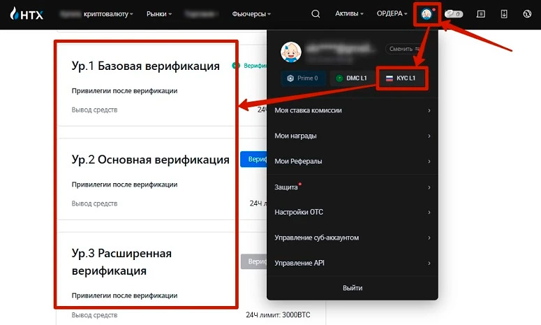 Для платежных операций на бирже HTX требуется верификация. Пользователи, которые ограничились подтверждением мобильного номера или электронной почты, могут вывести не более 1 BTC в сутки. Система уровней выглядит следующим образом.