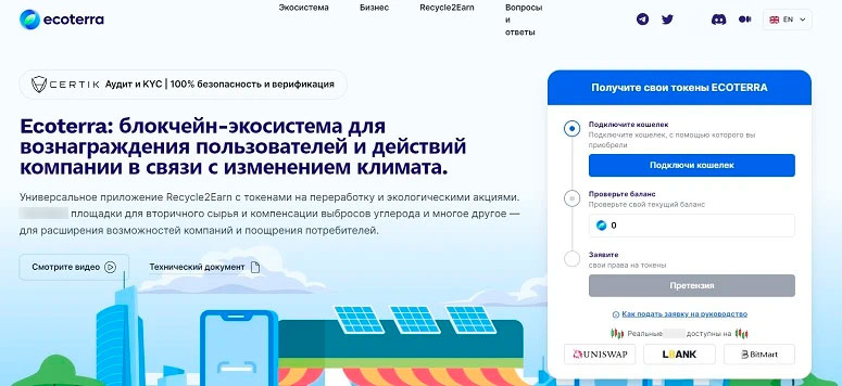 Ecoterra — еще одна дешевая криптовалюта с большим потенциалом. Это токен Web3-приложения, которое поможет физическим лицам и разным компаниям принять активное участие в переработке сырья.